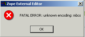 i use the externaleditor product and its win client. when i try and externaledit a file, in most cases the client sais: fatal error: unknown encoding: mbcs (some files generate this error, others dont...even with the same content type...)