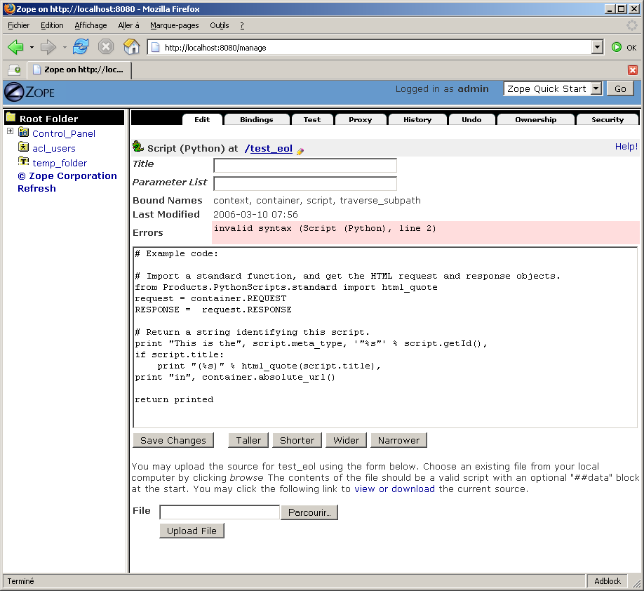 Attached is is screenshot of the error message. There is no error in the event log. Steps to reproduce : - Create a Python Script on the file system with Windows style line-endings - Go to http://localhost:8080/manage - Click the drop down list to add a Python Script - Enter "test_eol" in the id field - Click "Browse" to find and select your script on the filesystem - Click "Add" - Error : invalid syntax (Script (Python), line 2) - Click "Save changes" -> the error is gone. System information : - Windows 2000 SP4 (client and server) - Zope 2.9.1 (fresh install with http://www.zope.org/Products/Zope/2.9.1/Zope-2.9.1-win32.exe installer) - Only product installed : ExternalEditor 0.9.1 # Zope version: (Zope 2.9.1, python 2.4.2, win32) # Python version: 2.4.2 (#67, Sep 28 2005, 12:41:11) [MSC v.1310 32 bit (Intel)] # System Platform: win32 # SOFTWARE_HOME: C:\Program Files\Zope-2.9.1\lib\python # INSTANCE_HOME: D:\Zope-Instance # CLIENT_HOME: D:\Zope-Instance\var # Process ID: 1080 (1460) # Running for: 14 min 14 sec # sys.path: D:\Zope-Instance\lib\python D:\Zope-Instance\lib\python C:\Program Files\Zope-2.9.1\lib\python\Zope2\Startup C:\Program Files\Zope-2.9.1\lib\python C:\Program Files\Zope-2.9.1\lib\python C:\Program Files\Zope-2.9.1\bin\python24.zip C:\Program Files\Zope-2.9.1\bin\DLLs C:\Program Files\Zope-2.9.1\bin\lib C:\Program Files\Zope-2.9.1\bin\lib\plat-win C:\Program Files\Zope-2.9.1\bin\lib\lib-tk C:\Program Files\Zope-2.9.1\bin C:\Program Files\Zope-2.9.1\bin\lib\site-packages C:\Program Files\Zope-2.9.1\bin\lib\site-packages\win32 C:\Program Files\Zope-2.9.1\bin\lib\site-packages\win32\lib C:\Program Files\Zope-2.9.1\bin\lib\site-packages\Pythonwin On 3/10/06, Brian Sullivan <briansullivan@gmail.com> wrote: