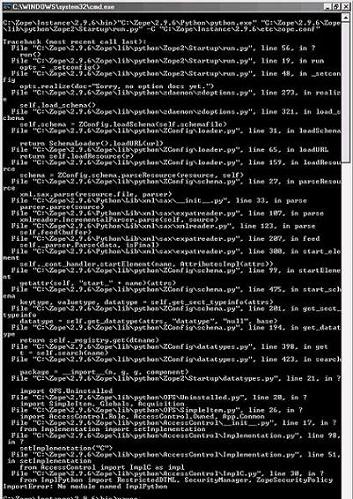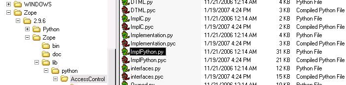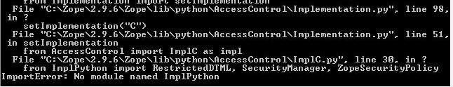 File "C:Zope\2.9.6\Zope\lib\python\AccessControl\Implementation.py", line 51, in setImplementation From AccessControl ImplC as impl File "C:Zope\2.9.6\Zope\lib\python\AccessControl\ImplC.py", line 30, in ? From ImplPython import RestrictedDTML, SecurityManager, ZopeSecurityPolicy ImportError: Non module named ImplPython