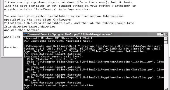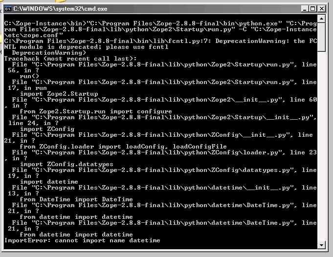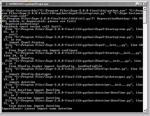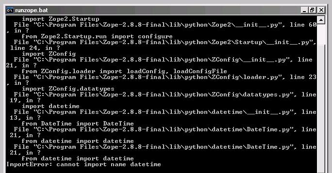 I know exactly zip about zope on windows (i'm a linux user), but it looks like the zope installer is not finding python on your system ('datetime' is a python module; 'DateTime.py' is a Zope module). You can test your python installation by running python (the version specified by the .bat file: C:\Program Files\Zope-2.8.8-final\bin\python.exe), and then at the python prompt type: from datetime import datetime and see what happens. good luck! Jonathan
