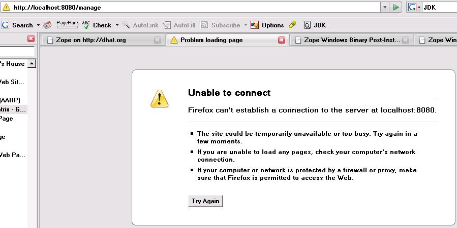 Jonathan ~ I didn't have any version of Python installed! I was wondering about Python. But since nothing I saw in the installation sequence or the Zope Book said otherwise, I figured maybe it was built into the Zope package. I guess no one who wrote this stuff ever guessed that anyone would not know something so "obvious". So. 1. I installed Python 2.3.5 (again matching the version on my target server), tried to start the previously installed Zope. and got the same error again. 2. I uninstalled and reinstalled Zope 2.8.8, and tried to start it and run the ZMI. Same error (see attachment 02 for the command line results and 03 for the ZMI error). I have tried to do everything in a very standard way, and my whole system is fairly new, so less likely than some to be contaminated by history. Any other suggestions? ~ Thanks ~ Ken -----Original Message----- From: Jonathan [mailto:dev101@magma.ca] Sent: Thursday, January 18, 2007 2:50 PM To: Ken Winter; Zope List Subject: Re: [Zope] FW: Problem Starting Zope after Installation What version of python are you running? (you need 2.3.4 or better) Jonathan ----- Original Message ----- From: Ken Winter <mailto:ken@sunward.org> To: Zope List <mailto:zope@zope.org> Sent: Thursday, January 18, 2007 2:40 PM Subject: [Zope] FW: Problem Starting Zope after Installation Hi Zope ~ I just installed Zope 2.8.8 (version selected to match a server I'm developing for) on my Windows XP machine, using the instructions in the Zope Book (http://www.plope.com/Books/2_7Edition/InstallingZope.stx#0-0), and electing not to run it as a service. I can't get it to start - see the attached screen shot for the failure messages. ~ TIA ~ Ken _____ _______________________________________________ Zope maillist - Zope@zope.org http://mail.zope.org/mailman/listinfo/zope ** No cross posts or HTML encoding! ** (Related lists - http://mail.zope.org/mailman/listinfo/zope-announce http://mail.zope.org/mailman/listinfo/zope-dev )