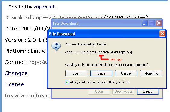 I have this slight problem whenever I try to download Zope-2.5.1-linux2-x86.tgz . Instead of being able to save the with the extension “.tgz” it saves it as “.gz” As I’m new to Linux I’m wondering if this is one of the reason I can’t seem to follow McDonc’sInstallation tutorial (step 5). I took the liberty of saving a screenshot of the dl for you to see.