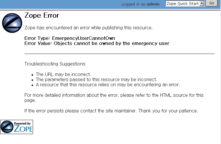 You need to go to http://yourhost/acl_users and add a user. The inital user that Zope sets up for you when you install Zope isn't allowed to own any objects. Create a new user, log in as that user and you should be fine.